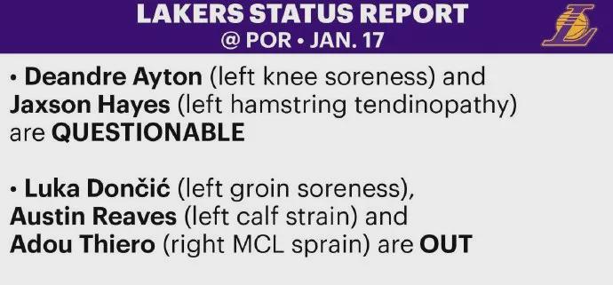 根据湖人官方公布的伤病报告,东契奇(左侧腹股沟酸痛)、里夫斯(左小腿拉伤)和蒂耶罗(右膝内侧副韧带扭伤)休战,艾顿(左膝酸痛)与海斯(左腿筋肌腱炎)出战成疑。